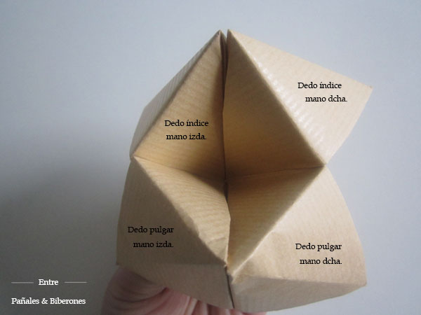 Investigando un poco por la red me he encontrado que a este juego tradicional de origami se le llama de muchas maneras diferentes que yo desconocía, de hecho, no tenía idea de que tuviera ningún nombre en concreto !! Puedes ver aquí la amplia variedad de nombres que recibe, así como algunas ideas para usar este juego tan divertido de forma diferente.