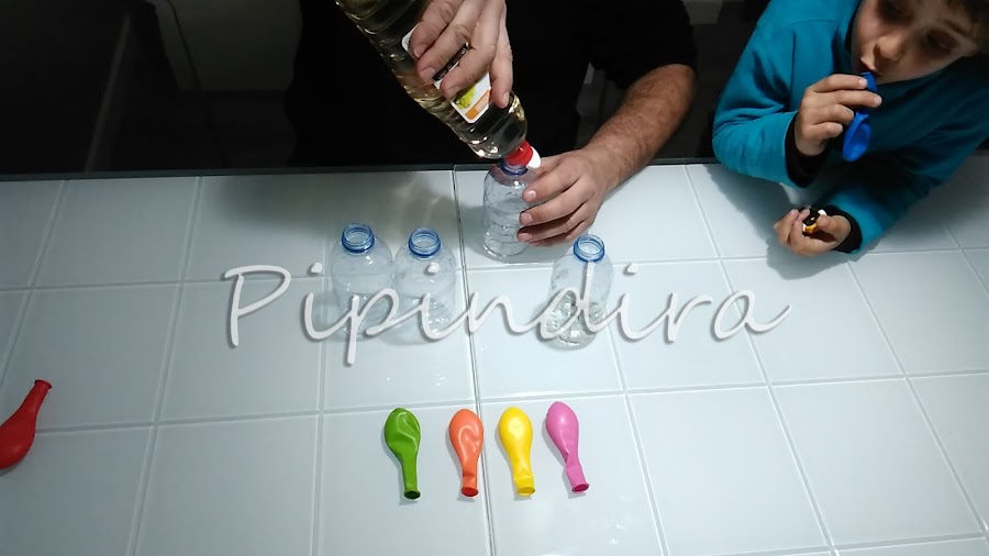 Una vez colocadas levantamos el globo y echamos el contenido en la botella y que se haga la magia.