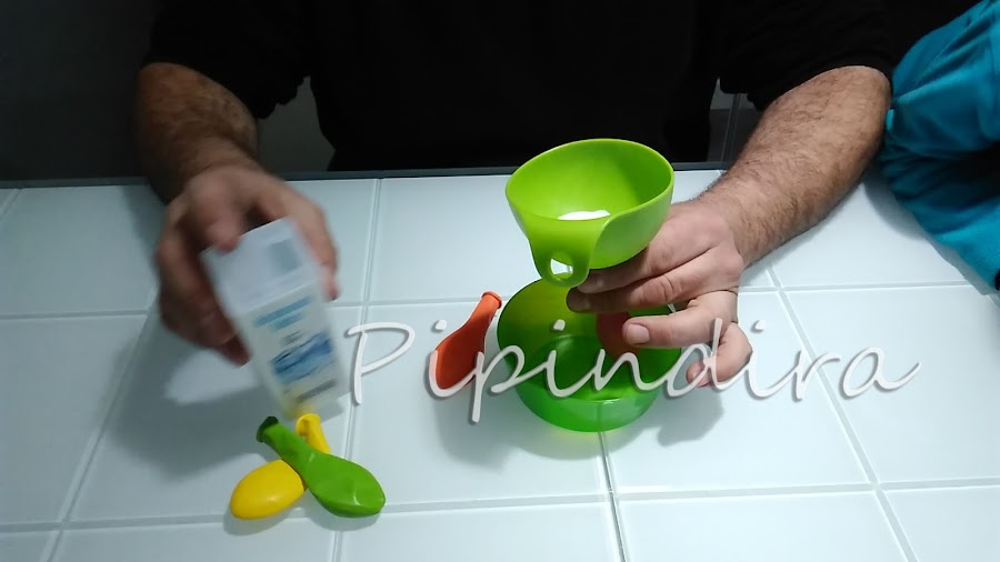Con ayuda del embudo vamos echándole bicarbonato a los globos.