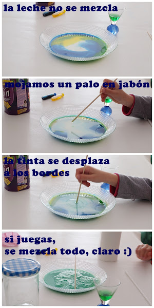 ¿Qué hicimos? Vimos cómo reaccionan los líquidos al ponerlos juntos, la verdad es que es muy curioso. Lo encontré en Youtube, es un experimento de clase de unas chicas de instituto, ellas lo llamaron: Leche de colores, explican muy bien todo, la verdad.