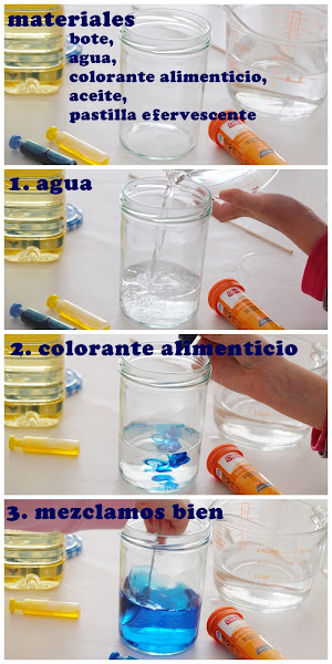 Materiales para este experimento: bote, aceite, agua, colorante alimenticio, pastilla efervescente; ya, así de fácil igual de fácil que el anterior experimento.