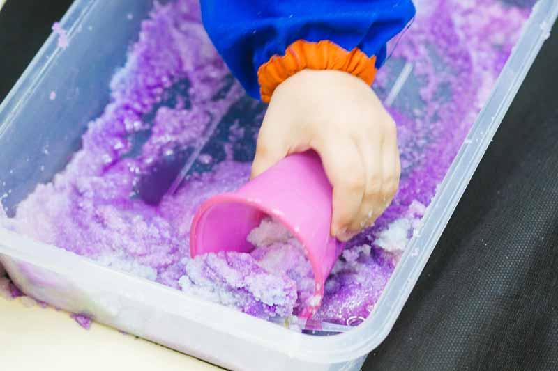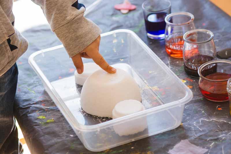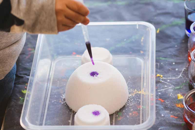 Ahora animad a vuestro peque a que cargue la pipeta con alguno de los colores y la descargue sobre “los castillos” de sal. Recordad que nosotras estamos ahí para supervisar y colaborar pero las decisiones las deben tomar los peques, no debéis interferir en la actividad, podéis proponer pero no ordenar ya que los niños y las niñas deben aprender de sus propios descubrimientos.