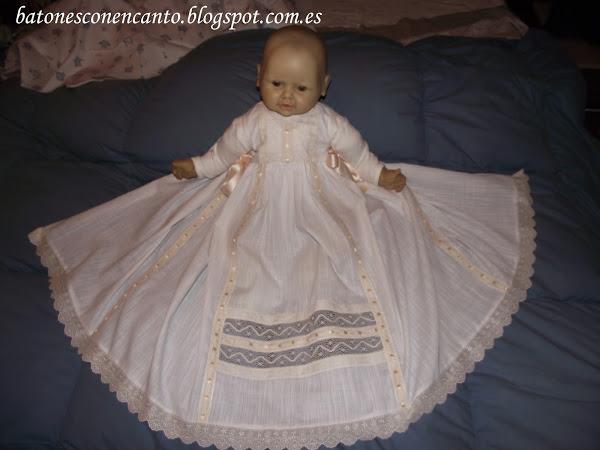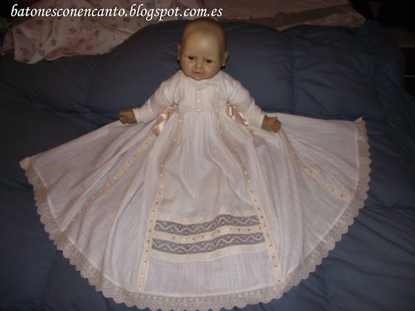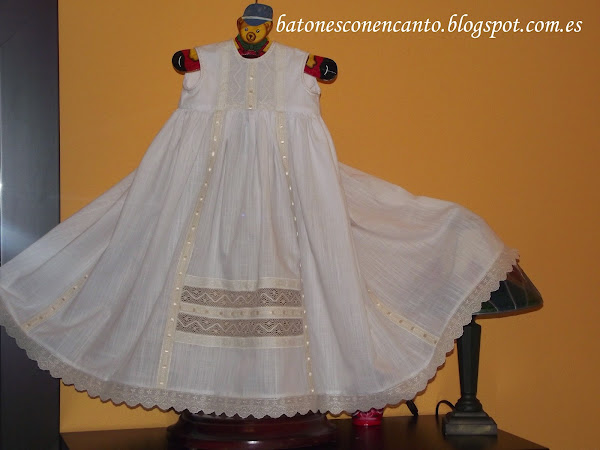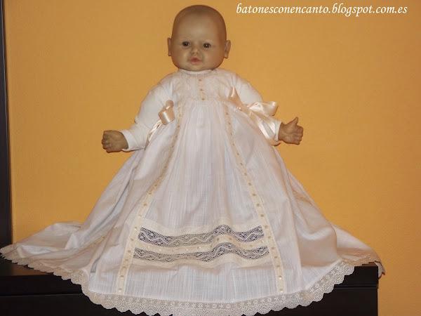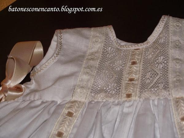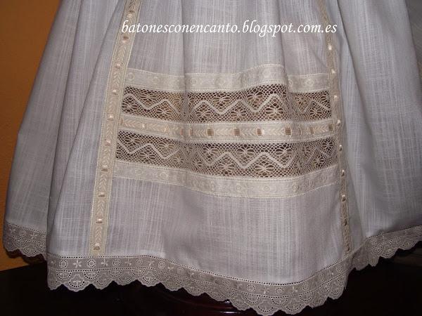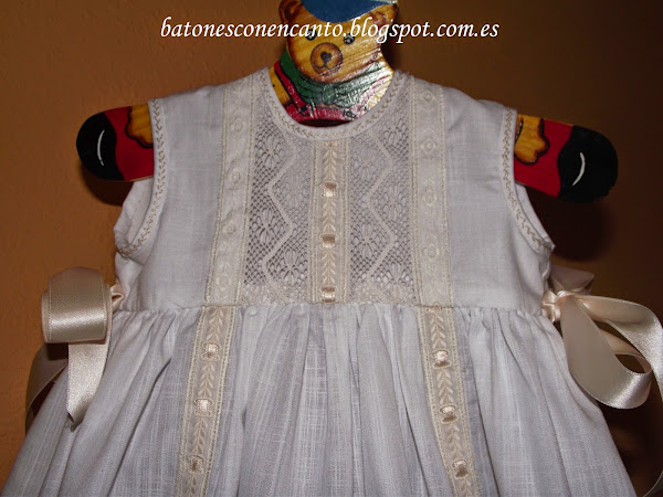 Esta vez lo he hecho con tela semi hilo blanca y le he puesto tirabordadas, encanjes y pasacintas en color beige, una combinación de colores que me gusta mucho.