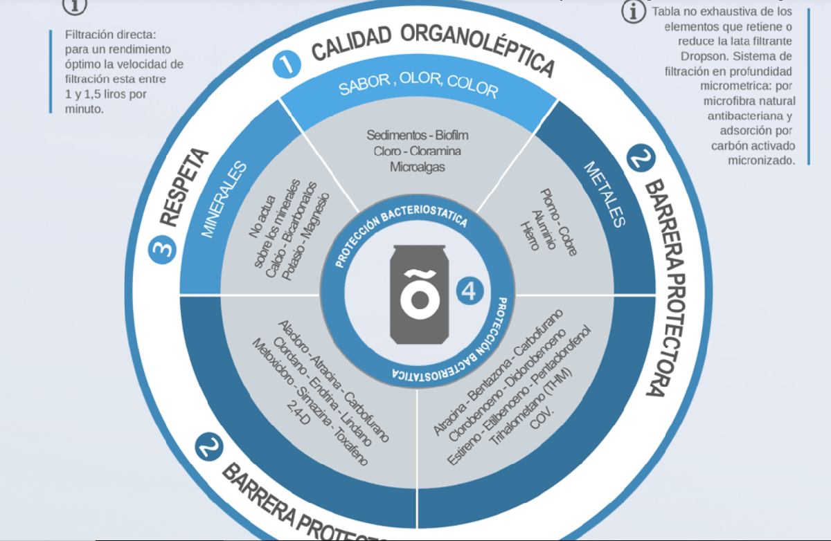 Filtros dropson. Es un filtro que se instala al grifo y purifica el agua al instante. Es como una lata de refresco. El límite es 3 meses o 300 litros. Son unos 16 euros por filtro. Elimina el cloro, productos químicos, metales pesados y partículas orgánicas… Osea que alrededor de 65 euros al año, ahorras dinero y plástico. Más información técnica sobre el filtro aquí. El filtro es 100% natural, compuesto por: micro fibra vegetal, carbón activado micronizado y agentes antibacterianos de origen orgánico sin químicos. Filtros Dropson son una empresa española y los filtros se producen en Alicante, con materias primas nacionales.