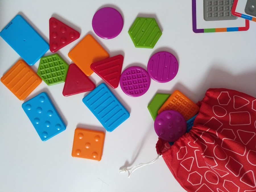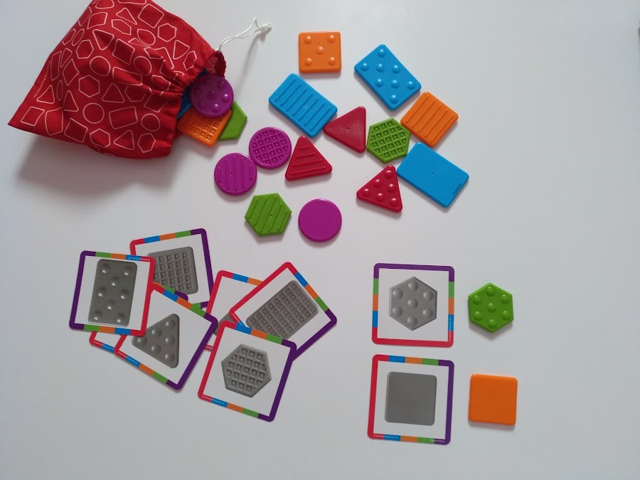 BUSCA EN LA BOLSA: colocamos una pieza geométrica en la mesa y las demás las metemos en la bolsa. Deberá meter la mano en la bolsa y buscar su pareja según la forma. Después lo haremos igual pero con las diferentes texturas.