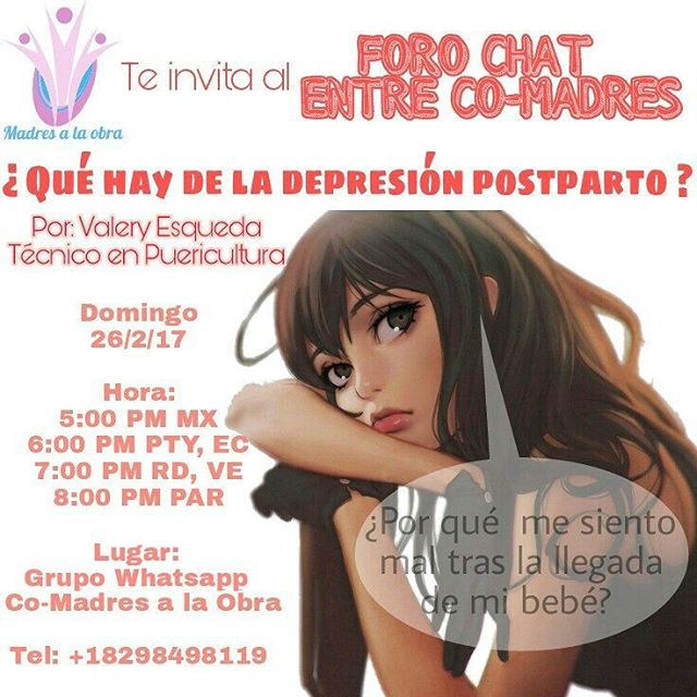 Tú o una amiga puede estar pasando ella. Muchas veces sin saberlo. Únete a nuestro grupo de Whatsapp y participa de este interesante foro-chat en el que la puericultora Valery Esqueda tratará sobre la Depresión Post Parto: Cómo identificarla y manejarla. Cuándo debo pedir ayuda?