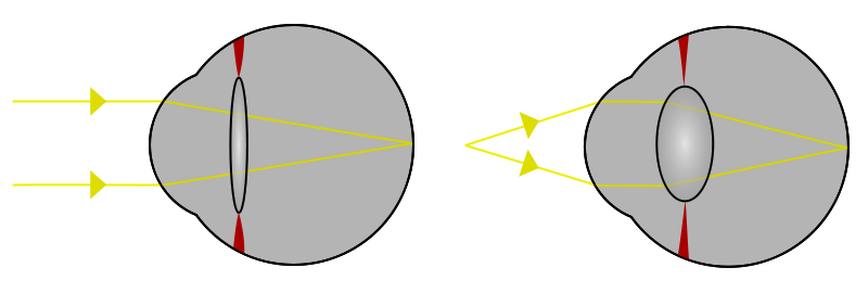 Mirad la imagen: el cristalino es ese circulo en medio del ojo. Veis como en el primero está más plano y en el segundo más abombado. Los hipermétropes juegan con eso para ver bien.