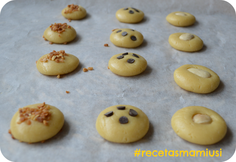 * Yo en casa las realice de diferentes versiones , con una almendra en el centro , con pepitas de chocolate , con crocanti ...en la receta no sale pero también podéis poner pasas,piñones, lacasitos , o fruta deshidratada.