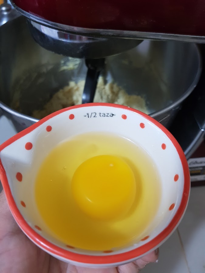 2. Luego añadimos la mitad de la harina cernida, bicarbonato, sal y polvo de hornear. Integramos. Añadir lo que resta de harina y mezclar.