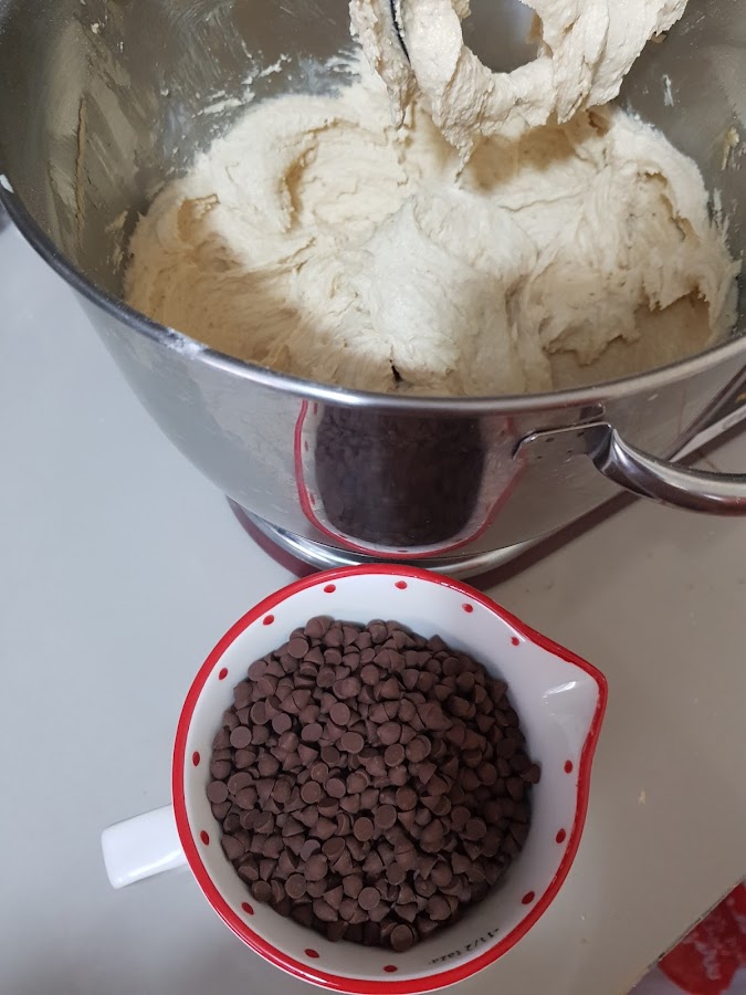 3. Enharinar los chips de chocolate con 1 cdta. de harina para que no se peguen. Los integramos a la masa anterior y batimos pero no mucho.