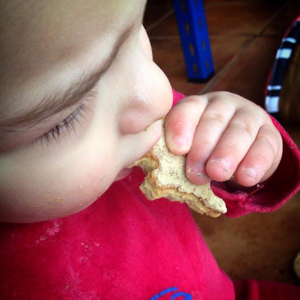 Yo tuve un ayudante muy implicado en su elaboración (Sergio), su hermano (Sebas) prefirió jugar con sus juguetes, a él eso de la cocina no le va mucho y aunque terminamos de hacerlas y nos fuimos directo a darnos baño (parecía que tuviera canas con todo el pelito lleno de harina) lo disfrutamos un montón y lo mejor fue el premio por tanto esfuerzo, como se las comía!!!