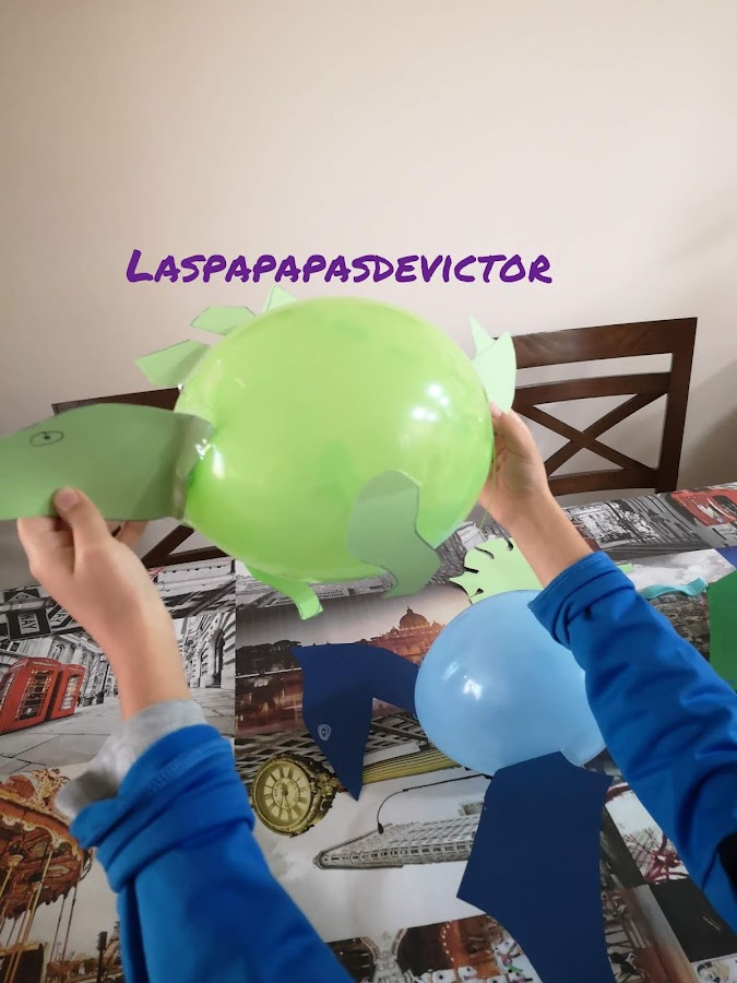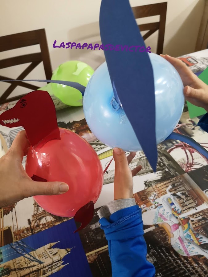 Un PTERANODON con cartulina de color azul y un T-REX con cartulina de color rojo