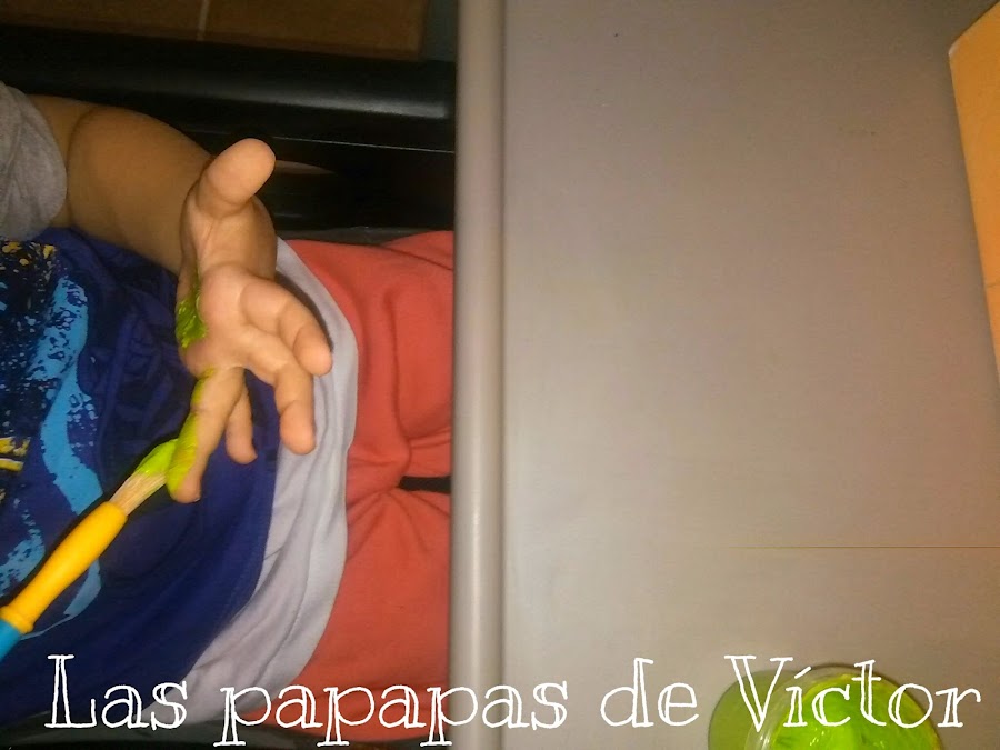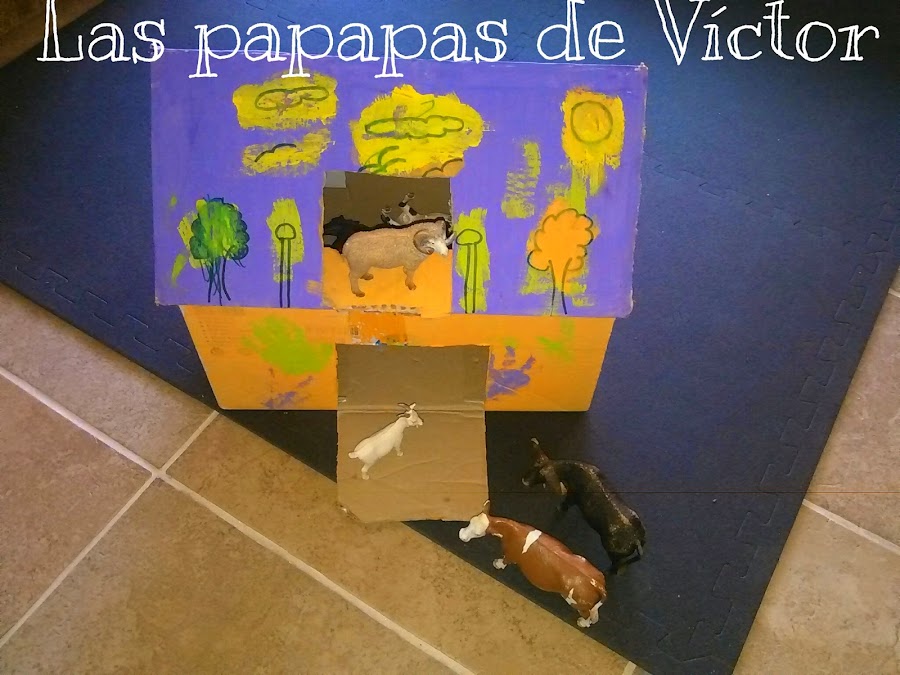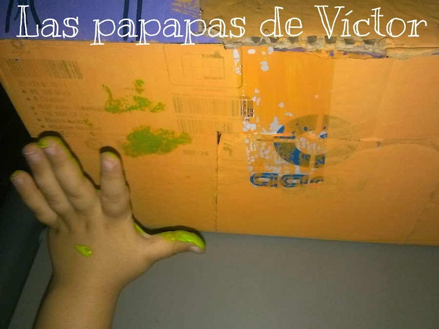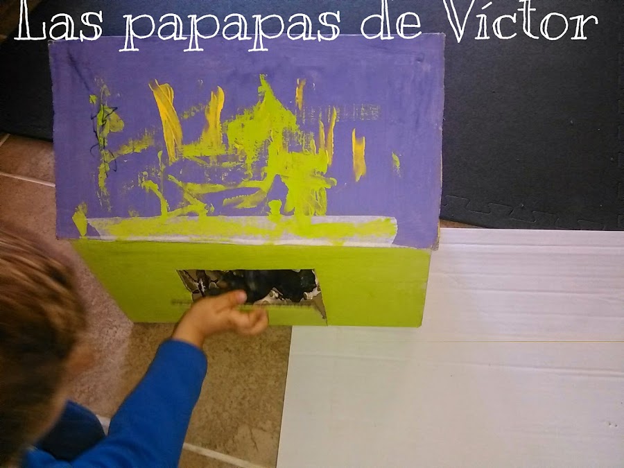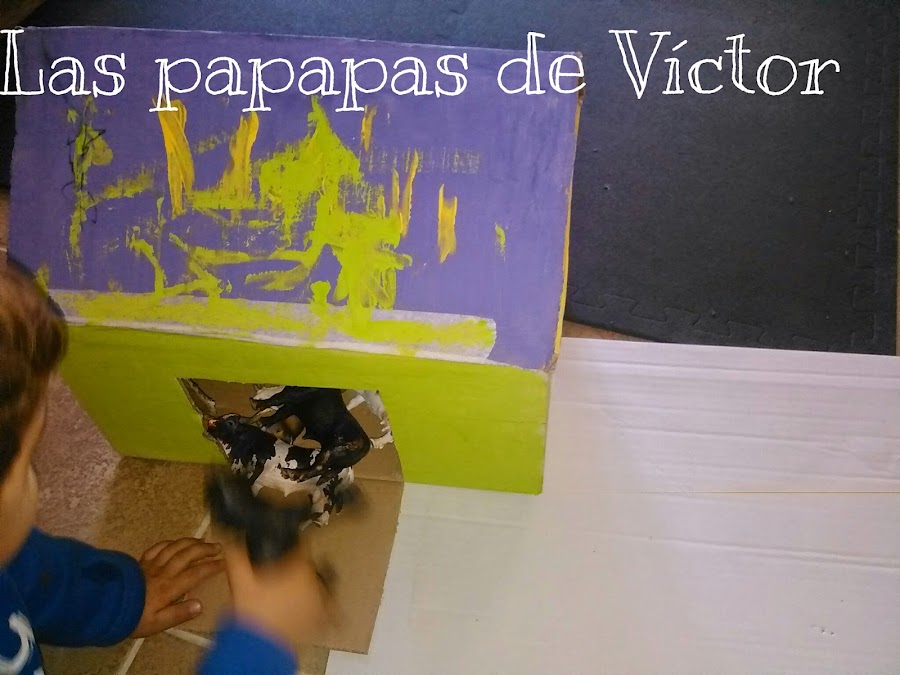 Ahora le pedis a vuestro ayudante preferido que os pinte a su imaginación la caja, mi niño la hizo de bastantes colores, dibujo abstracto con ceras en un lado de la caja, acuarelas del otro lado lado y pinturas de dedos en la parte delantera y trasera de la granja