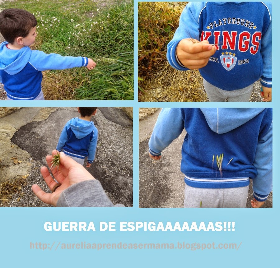Al principio se quedó mirandome y creí que se iba a poner a llorar porque le había llenado el pantalón de algo que él no conocía... pero rapidamente le cogió el truco y tuvimos nuestra primera guerrilla de espiguitas!!