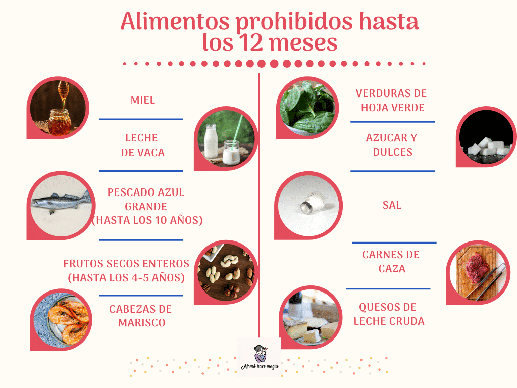 En la imagen que aparece a continuación están detallados estos alimentos que nunca debes ofrecer antes de los 12 meses del bebé.