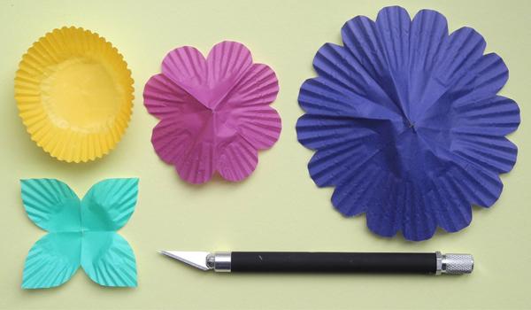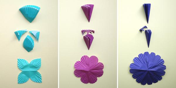 Para hacer una flor de 8 pétalos – dobla parte del papel de la magdalena en medio 3 veces, y con el punto de plegado corta en la parte superior dándole forma.