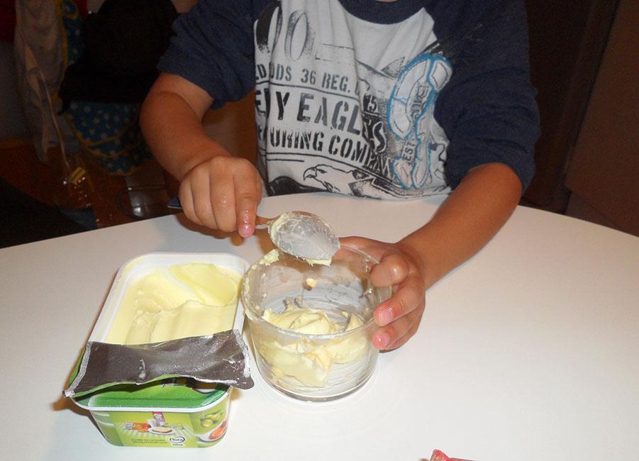 Los dos querían participar así que dividimos las tareas. El mayor se encargó de poner la margarina en un recipiente y pesarla para llegar a los 125gr. que se necesitaban. Con su cuchara iba cogiendo y poniendo mantequilla en un vaso, para luego poder derretirla en el microondas.
