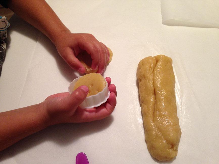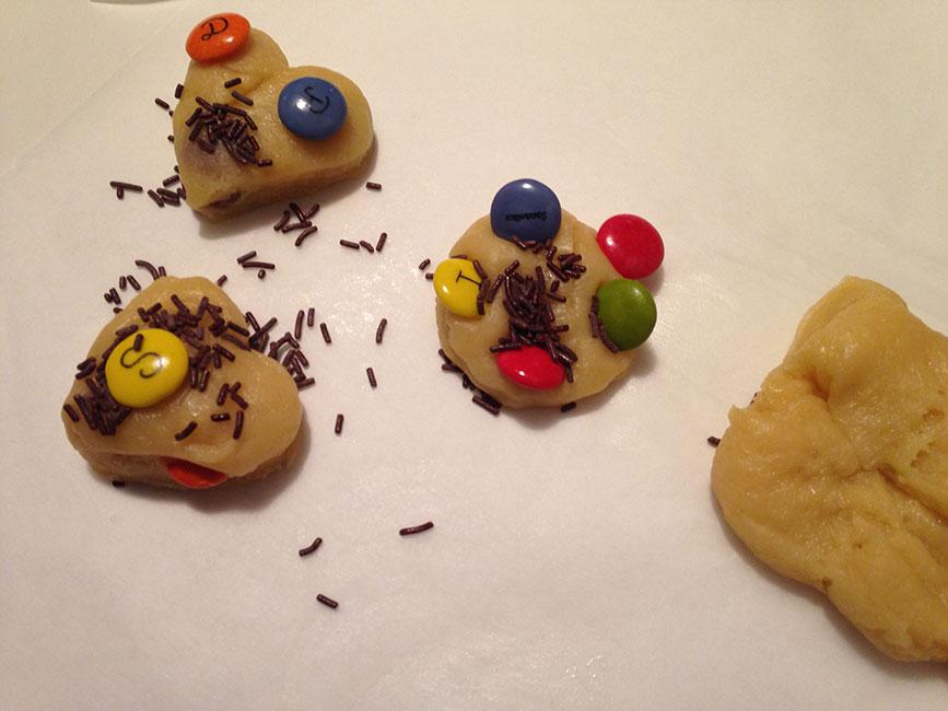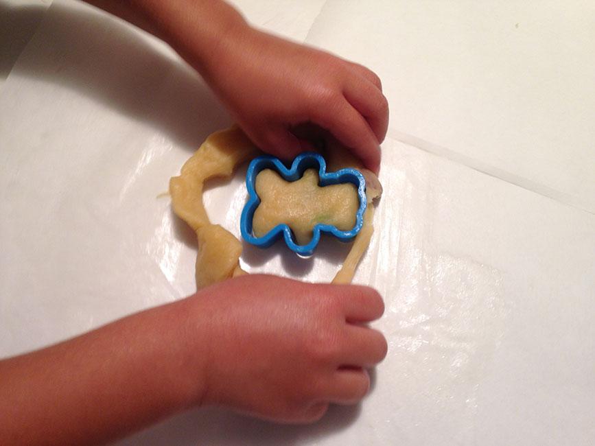 Cuando ya tuvimos la masa con la textura uniforme, lo siguiente ya era ir cogiendo trozos y darles forma. Había comprado hacía unos días unos moldes de esos con figuras variados para hacer galletas, así que se pusieron manos a la obra. Así que les pusimos un trozo de papel de horno y por cada trozo, elegían la forma a darle, le retiraban los sobrantes de masa y luego decoraban a su gusto (con lacasitos, fideos de chocolate, más azúcar vainillado… etc).