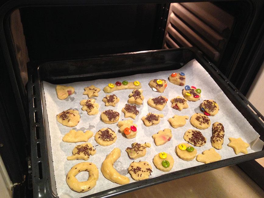 Una vez agotada la masa, (¡que parecía que no se acababa nunca!), colocamos todas las formas decoradas en el horno y a cocinarlo. Os recomiendo que si solo queréis probar con ellos a hacerlas, reduzcáis la cantidad de masa a la mitad, porque para formas pequeñas salen muchísimas galletas.