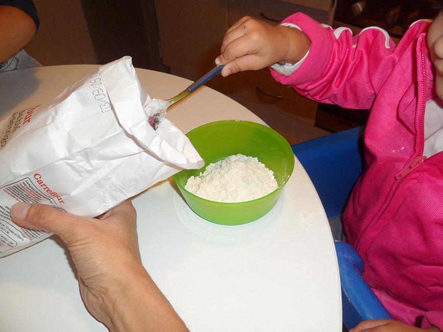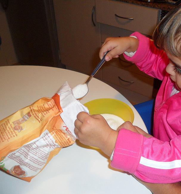 Mientras la peque iba midiendo primero la harina y luego el azúcar. Madre mía que bien se lo pasó. Yo la ayudaba a pesar y le indicaba si faltaba o no más harina.