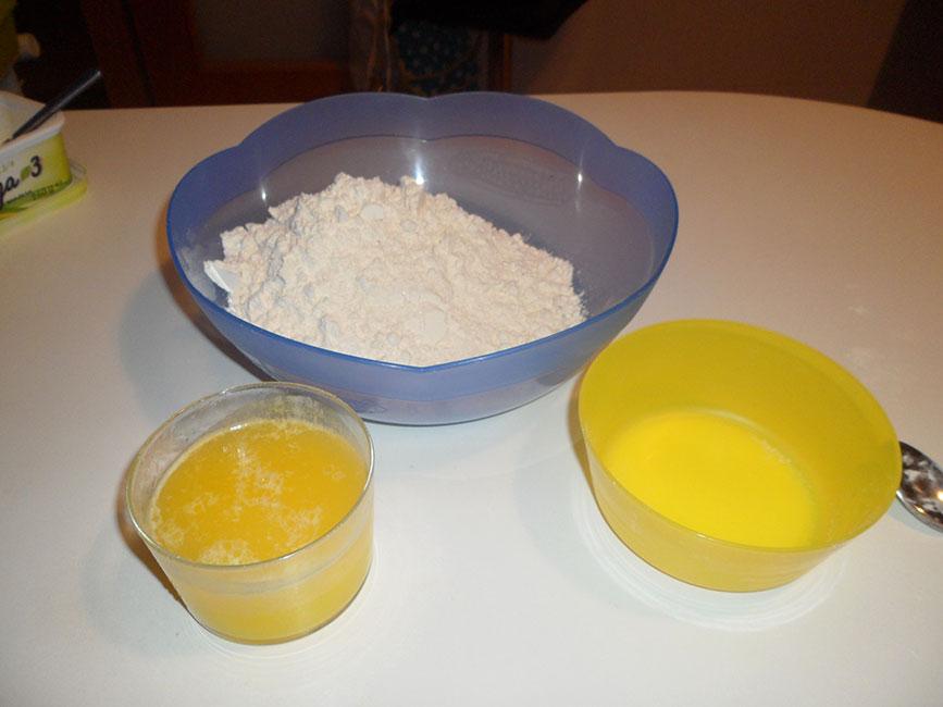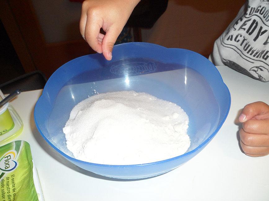 Ambos ingredientes se incorporaron a un bol grande (harina y azúcar). Mientras derretíamos la margarina, medimos los 5-10 gr. de azúcar vainillado y lo incorporamos al bol y también le pusimos la pizca de sal.
