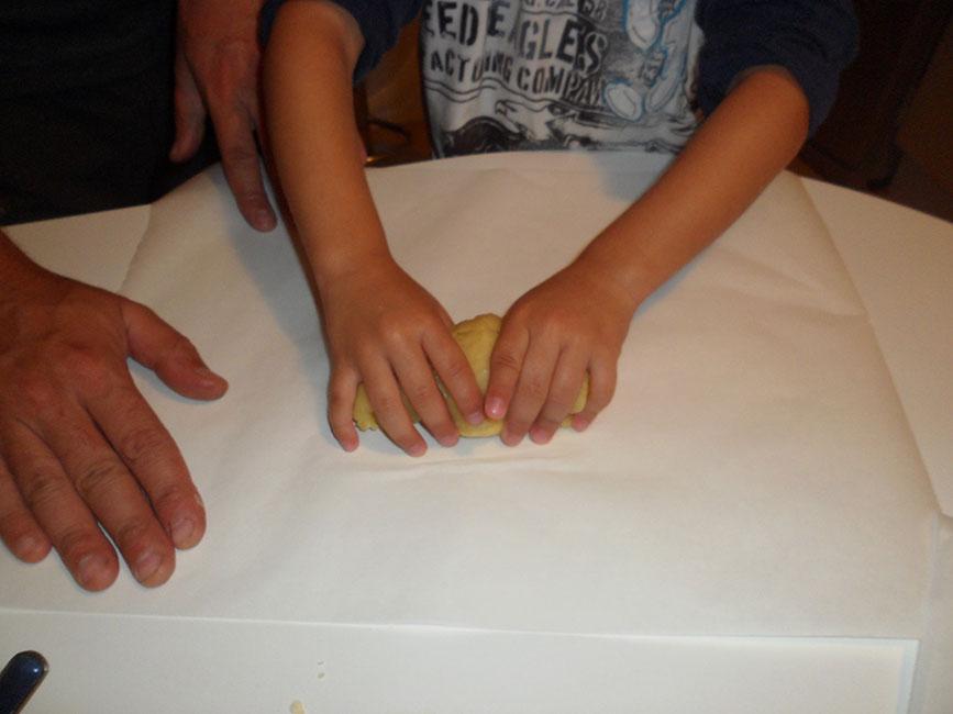 La pequeña mientras le encantaba coger trozos de masa con formas más alargadas y cortarla en trocitos con un cuchillo de esos para niños de Ikea. Y por supuesto, “un lacasito para la masa y otro para mí…”, jejejeje, no paró de comer lacasitos de todos los colores.