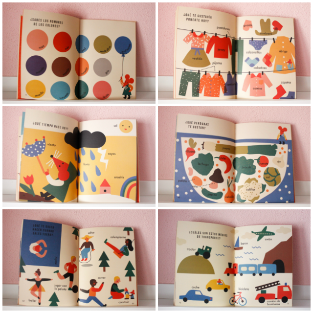 Un libro que ha sido un descubrimiento para Alicia por su simplicidad ha sido el que ahora os pongo, a mi personalmente pasar sus páginas me recuerda a mi infancia, será el tacto grueso de la hoja, el color, los dibujos con lineas tan rectas. Pero dentro de su estilo nos ha gustado, no se lee como tal, son palabras sueltas sobre temas en concreto.