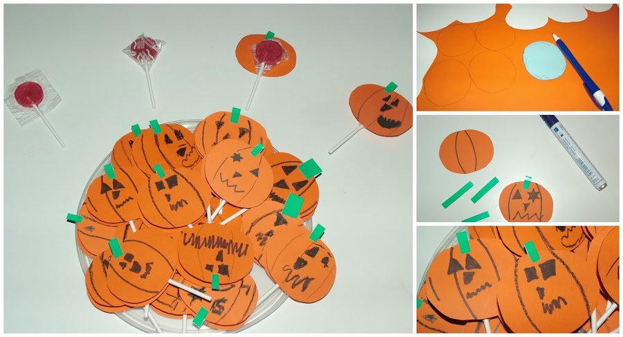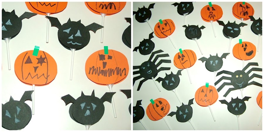 El caso es que baballa, como no (sus ideas me encantan siempre!!), publicó una entrada Piruletas araña- Halloween ya está aquí y me apunté la idea, pero la fiesta que estoy organizando es para más de 20 niños. Me pareció un poco complicado preparar estas piruletas para 20, además son niños bastante pequeños, así que preferí que no tuviesen patitas ni ojillos que pudiesen ser peligrosos.