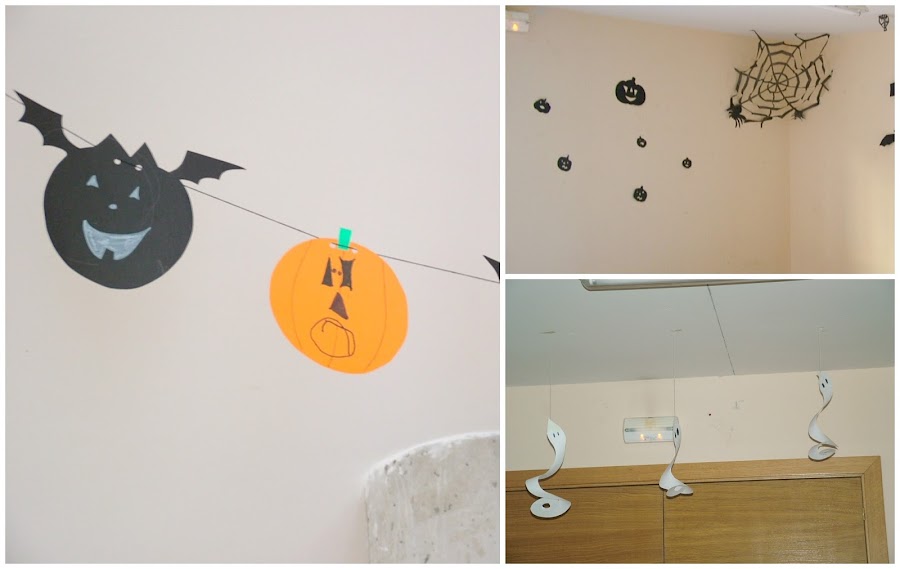 Guirnaldas: la idea me la saqué de aquí, Tinkerlab, es muy sencillito y la Peque Grande lo pasó fenomenal pintando ella la mayoría de las caras, como la primera me pareció un poco sosa, a la segunda le hice un pequeño cambio y en lugar de calabazas negras le puse unas alas y orejas y alterné los murciélagos con las calabazas, apenas se notó, pero me gustó un poco más.