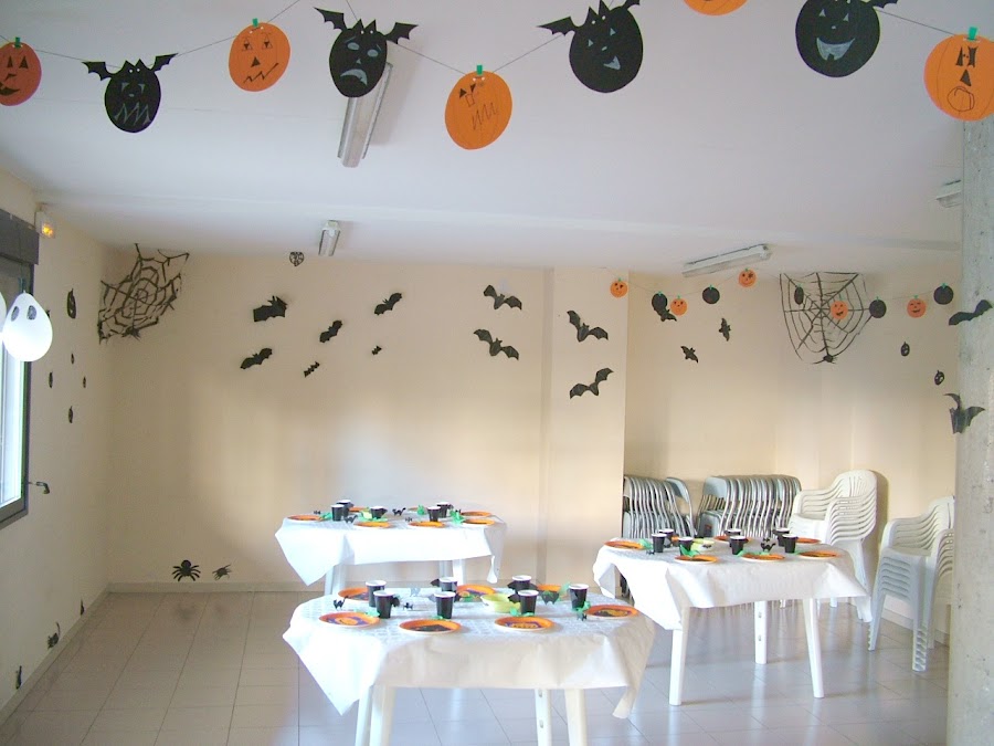 Un detalle que me sorprendió, utilicé los restos del plástico de las bolsas de basura con las que hice las telarañas para hacer figuras rápidas de murciélagos, fue algo que hice en el momento, les pinté dos detalles en blanco y los colgué, los veis bien en la columna. Bueno, pues fueron los que más gustaron, y eso que los hice sobre la marcha, dentro de la sala, cuando estaba colocando las cosas... Me sorprendió bastante la verdad, a veces lo que más gusta es lo que menos te esperas!!!