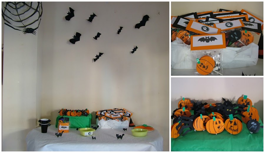 En este caso no había mesa de dulces, tan de moda ahora, pero para los peques les hice unas bolsitas con chuches y, por supuesto, las piruletas que ya os adelanté antes de la fiesta en Halloween: adornando las chuches.