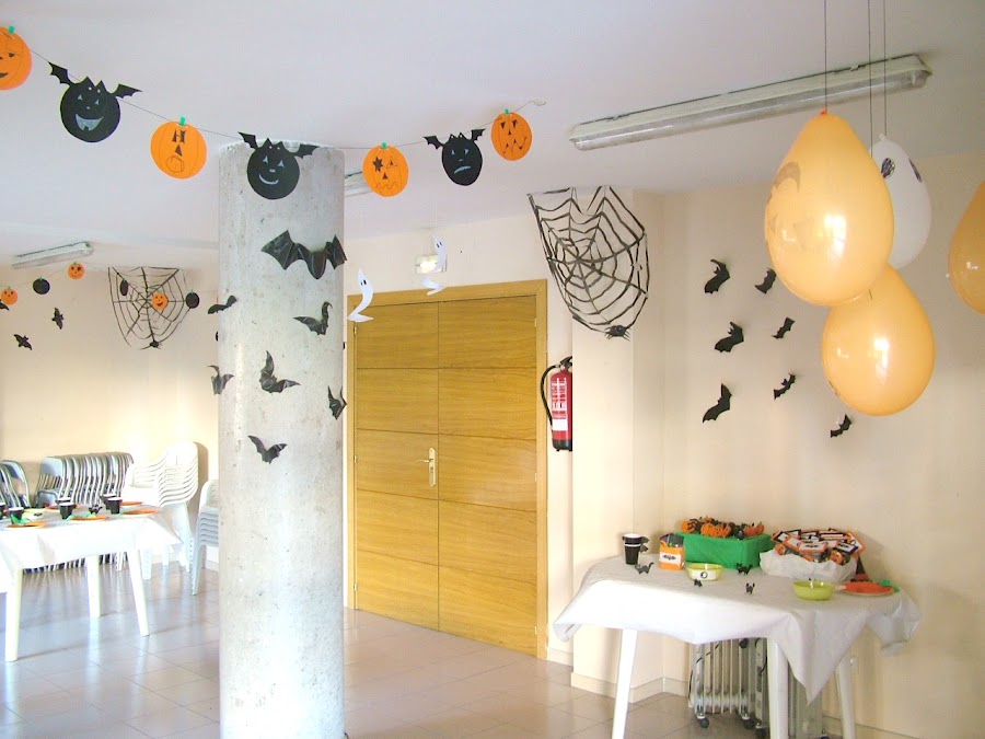 Globos naranjas, negros y blancos: colgados del techo con un hilo y con caras pintadas simulando calabazas, murciélagos y fantasmas, la inspiración es pinterest: aquí o aquí.