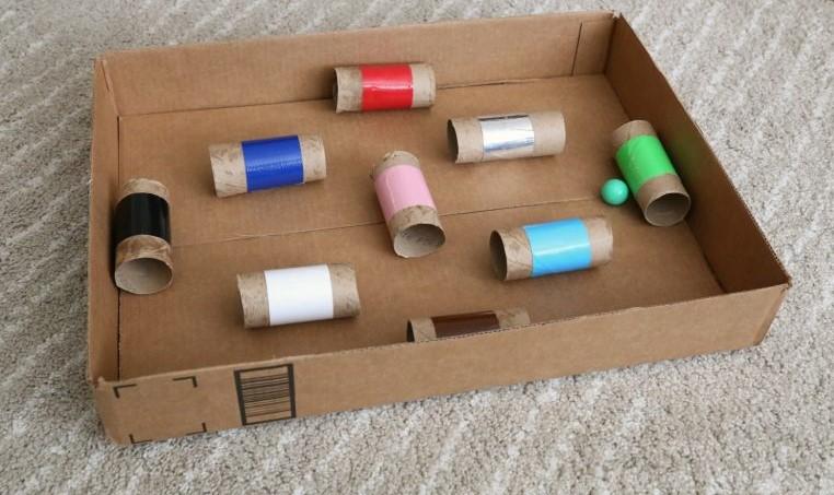 Primero, prepare su caja, para tener una superficie lisa para que ruede bien la bola, cortamos las solapas que tenga la caja y creamos un fondo plano.