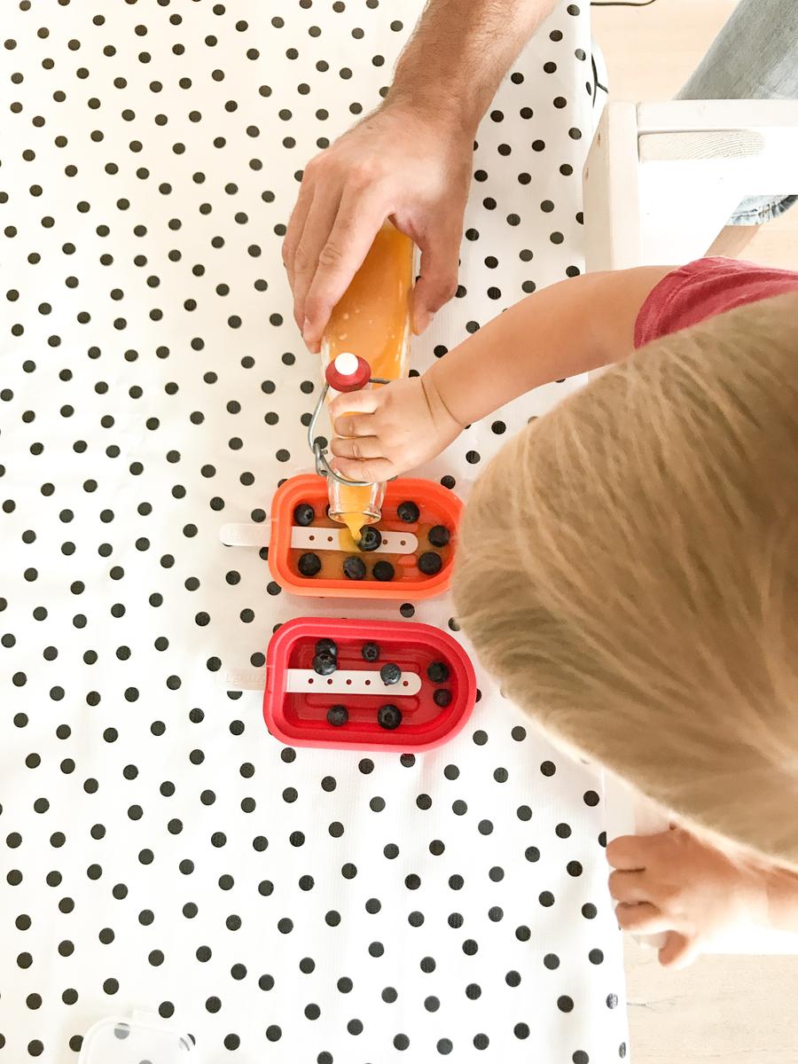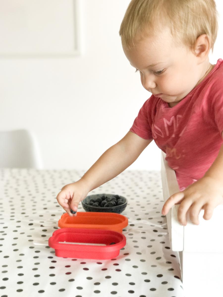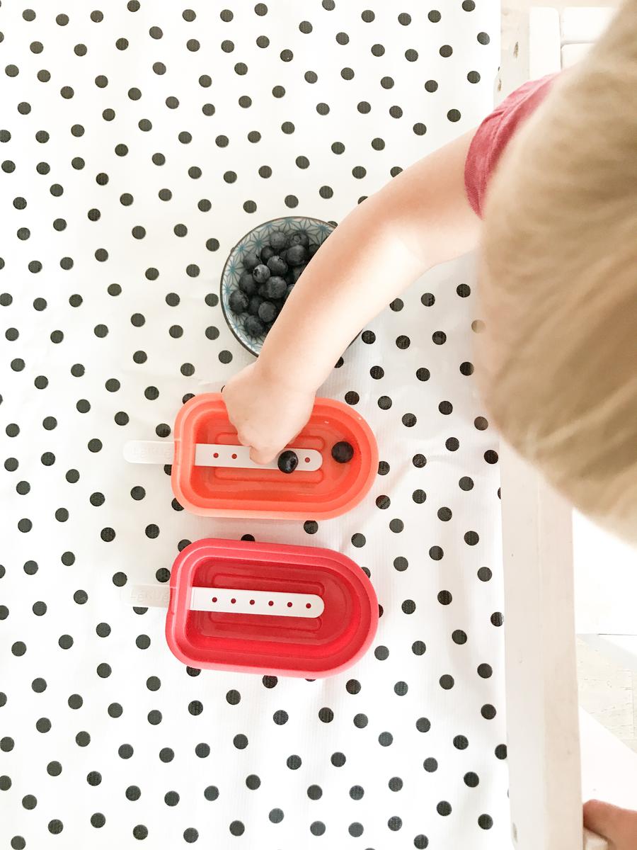 Para el helado 1 ponemos los arándanos en los moldes. Asegurándonos que queden bien repartidos, tanto debajo del “palito” como encima”.