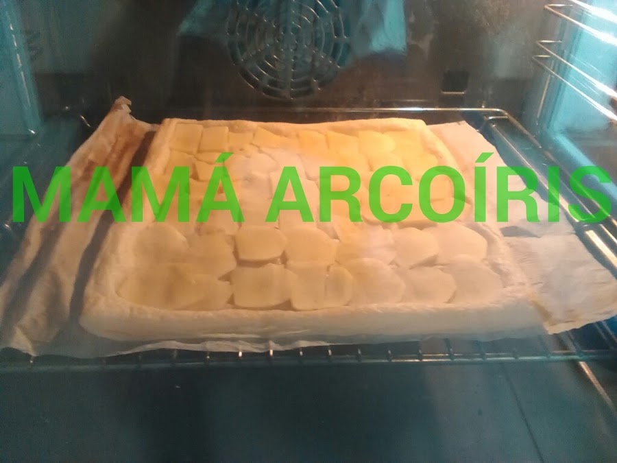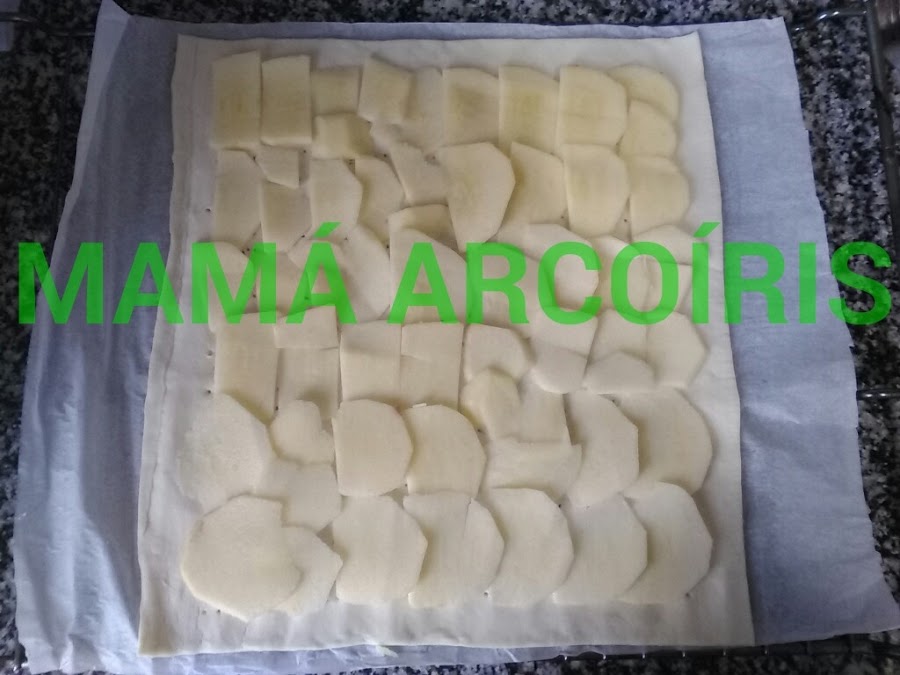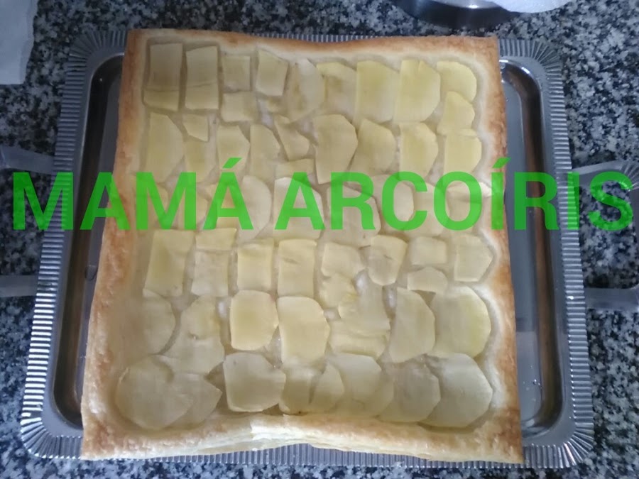 Ahora cortamos la manzana en láminas finas y las colocamos sobre la zona que hemos pinchado. Si la colocáis sobre la zona sin pinchar, la manzana se caerá cuando comience a inflarse el hojaldre. Yo he utilizado unas 2 manzanas pequeñas.