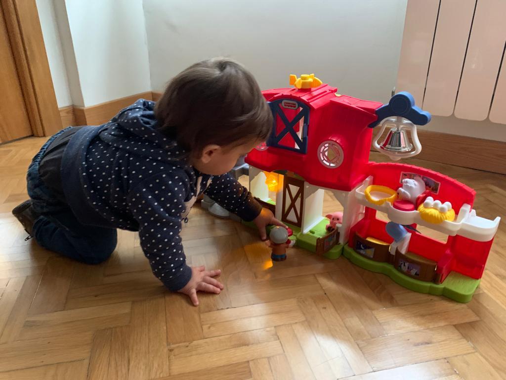 La granja viene totalmente montada (exceptuando una parte lateral con un par de tornillos), por lo que no tendremos que hacer nada antes de que el niño comience a jugar (¿a quién no le ha pasado el abrir un regalo y estar montándolo durante horas?Sobre todo está dirigida a la estimulación sensorial de los niños ya que tiene muchos sonidos, luece y partes con las que el niño puede comenzar a interacturar como una campana, un botón que emite sonidos y frases, una puerta para abrir y cerrar o un granero lleno de maíz (que está cerrado para evitar que los pequeños granitos salgan) que gira y con el cual el niño comenzará a practicar su psicomotricidad.