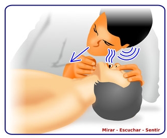 Después nos aseguraremos que la persona está consciente, para ello le gritaremos, le tocaremos y veremos si responde. Si responde colocaremos a la persona en posición lateral de seguridad (PLS) y le vamos revisando constantemente . No debemos dejarlo solo. Si no responde, tumbaremos a la víctima y realizaremos la maniobra frente-mentón. Esta maniobra consiste en desplazar con una mano la frente hacia atrás y con los dedos de la otra mano colocados bajo el mentón, elevar la mandíbula hacia arriba y delante. Así nos aseguramos de que la vida aérea quede despejada. Además, debemos ver que no exista ningún objeto extraño que pueda ocluir la vía aérea. Una vez realizada la maniobra, comprobaremos durante unos 10 segundos que la persona está respirando. Si no es así comienza la cadena de supervivencia.