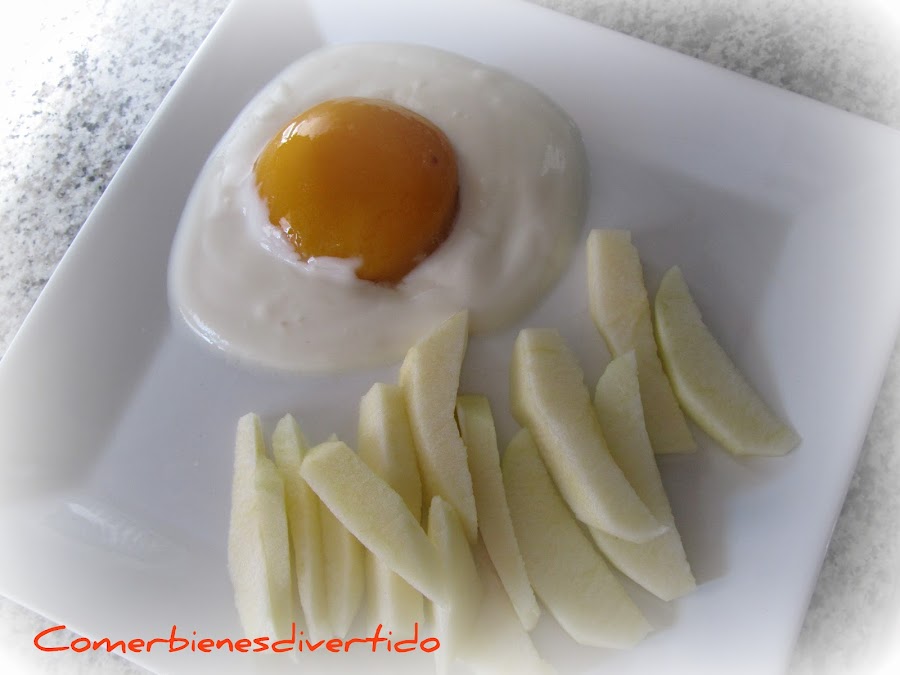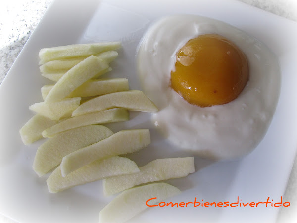 Pues aquí tenéis este postre, porque... a quien no le gusta un huevo frito con patatas??? Pero eso sí, este es muy especial ya que está hecho con frutas y yogur.