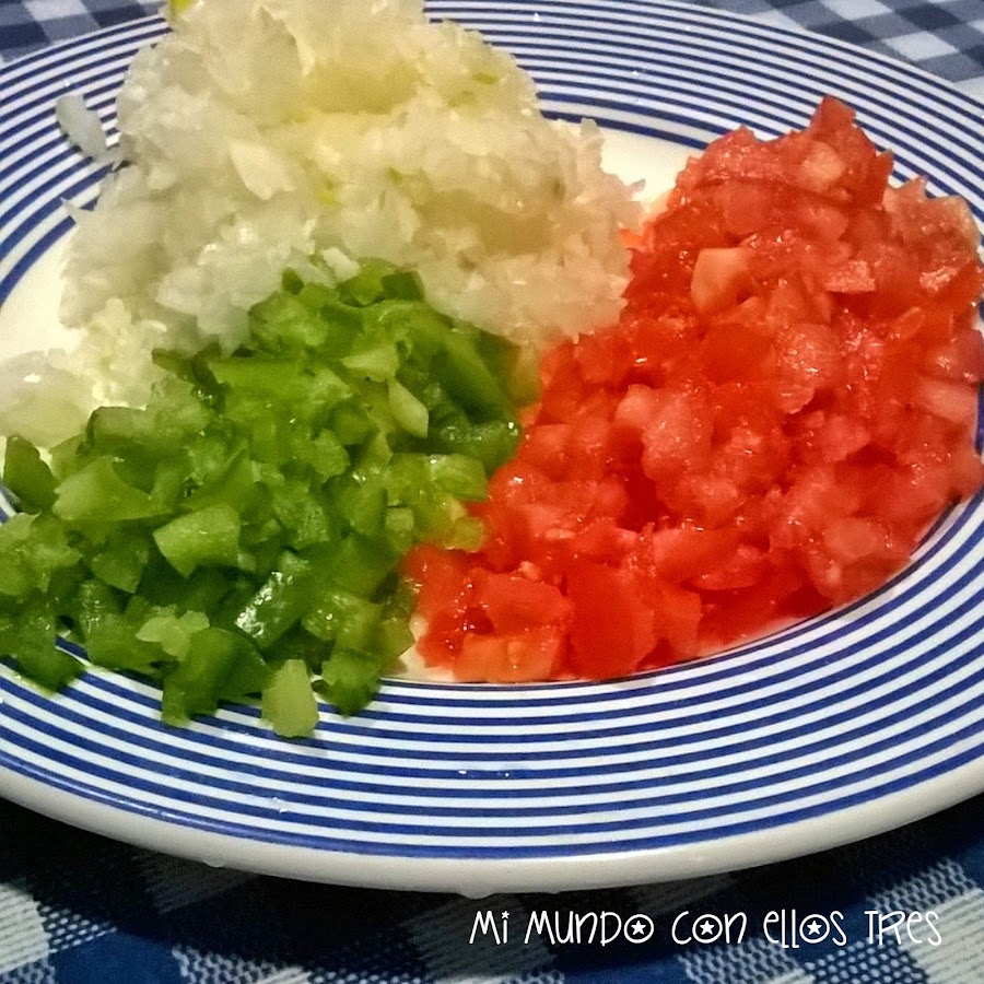 Cortamos muy finamente la cebolla, el tomate y el pimiento.