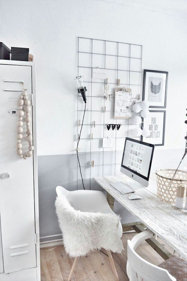 Y por ultimo este que me rincón de trabajo que me encanta pero a mi se me hace grande. Me gusta mucho la organización y distribución de las cositas aquí, y la idea de hacer una estantería de esa forma también me llama. Incluso se me ocurre que una rejilla y al lado una estantería de esas bonitas con cuerdas puede quedar muy mona.