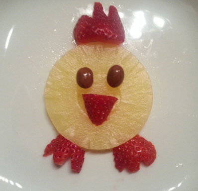 Un Pollito tan rico jeje con piña, fresa y dos bolitas de chocolate ^^
