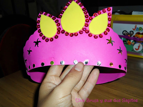 Aunque, tal vez prefieras usar los archivos como molde para desplegar tu imaginación y hacer tu propia corona, como hice yo, con el molde de la corona de Rapunsel que baje de la página de Disney junior.