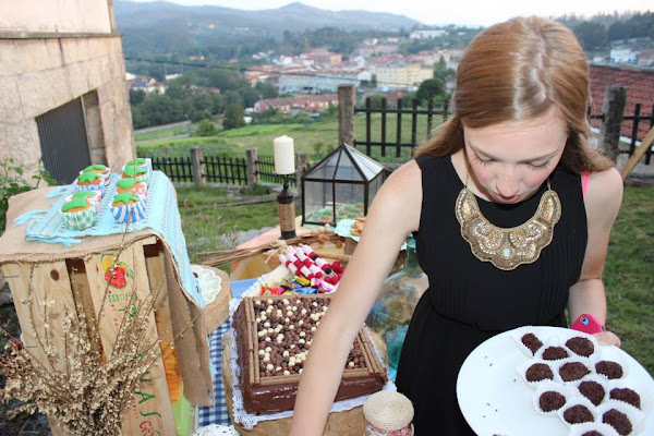 Y para la mesa dulce o "Candy bar" usé un mesón de centro con manteles a cuadros y hacia la parte frontal, cajas de frutas colocadas de distintas formas, sobre ellas, todos los adornos que me parecían que más podían ir con ese estilo, una jaula de pájaros en blanco roto, velas y porta velas, damajuanas, troncos gruesos a modos de bandejas. Sobre todo esto colocamos la tarta, los cup cakes, trufas, galletitas y pinchos de gominolas, todo esto hecho en casa con la ayuda de mi familia ;))