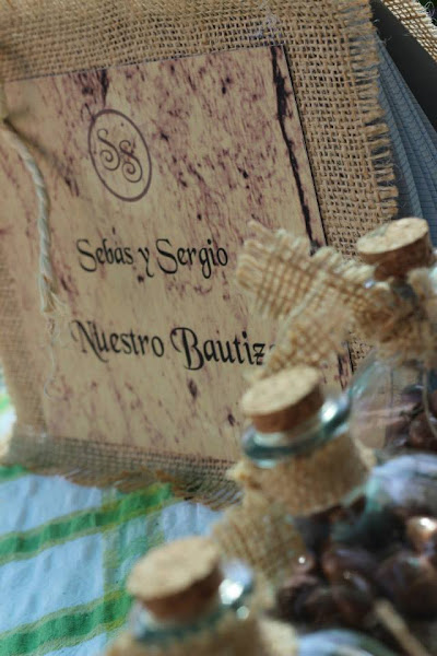 Lo primero que hice, fueron los recuerdos. Compre, en un pequeño comercio de mi pueblo, unas pequeñas botellitas de cristal con taponcitos de corcho y las rellene de conguitos, una tira de tela de saco amarrada arriba y diseñe un logo para su bautizo, lo hicimos para las invitaciones, tarjetones, etiquetas para botellitas y libro de firmas.