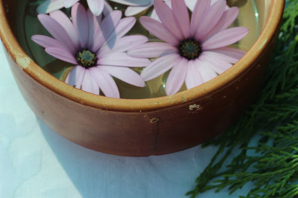 En tarteras de barro, coloqué agua y corté margaritas de mi jardín, flotando, rodeadas por follaje de pino ¡el efecto es precioso!