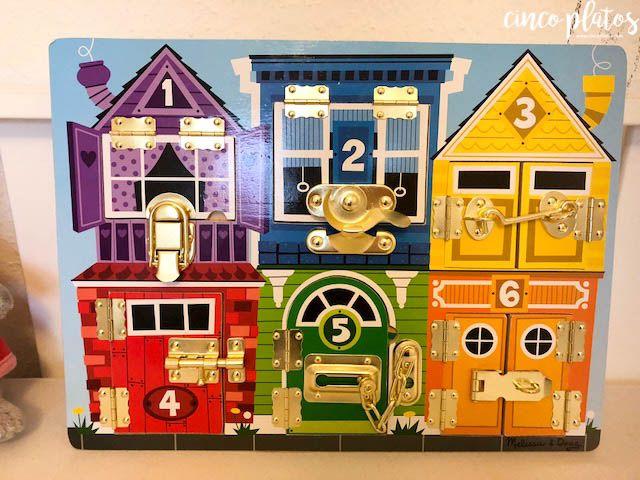2: Tabla de cerraduras: otro exitazo. N no suele entretenerse demasiado tiempo con juguetes y este le ha chiflado. Lo hace una y otra vez en bucle y a su hermana también le ha encantado. Es de la firma Melissa and doug.