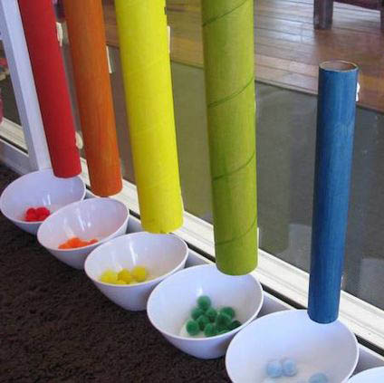 Como veis en la foto, se trata que el peque cuele las bolitas por el tubo del mismo color. Debajo deberéis poner un recipiente por cada color para que vaya recogiendo las bolas que vaya echando, de esta manera, si se equivoca y cuela una bolita azul en el tubo amarillo rápidamente se dará cuenta del error.