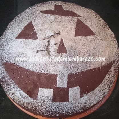 Por suerte me he convertido en una madre de recursos y en mi casa nunca falta lo necesario para hacer un bizcocho. Así que decidí hacer un bizcocho de chocolate y tunearlo para que pareciera una calabaza. La idea inicial que me pasó por la cabeza fue la de cubrirlo con fondant naranja y decorarlo pero uffff la pereza infinita y las ganas de meterme en la cama me hicieron desistir de la idea. Así que le dije a mi santo que recortara unos triángulos y lo que venía siendo una sonrisa de calabaza de halloween y lo utilizaría como plantilla para decorar el bizcocho con azúcar glass. Simple pero efectivo. Del bizcocho no quedaron ni las migas (ni el plato, aún estoy esperando que me lo devuelvan).