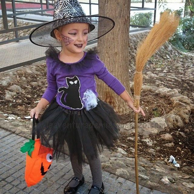Vamos al lío. El jueves fue la fiesta en el cole de la peque, que decidió que quería disfrazarse de bruja con escoba para volar y gorro. Lo que vienen siendo todos los avíos brujiles. Ahí que me fui yo a comprar un disfraz pero no me gustaba ninguno, demasiado "perfectos". Fui al chino a acompañar a una amiga que iba a comprar cuatro tonterías para ella y allí vi unas faldas de tul por poco más de 2â?¬. Cogí una en negra, con la previsión de que era muy apañada y podría servirme para diferentes disfraces. Aproveché y compré una escoba y un gorro de bruja tamano niña. Y de paso, un par de guirnaldas con forma de araña en su tela y gatos negros, y una tela de araña con arañitas. Ahora que lo pienso, mi niña podía haber ido de reina de las arañas. Ya tengo idea para el año que viene. No me gasté ni 5â?¬ en total