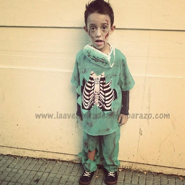 Mi príncipe decidó a última hora disfrazarse de enfermero zombie. Pasó de zombie a secas a vampiro, demonio, esqueleto... pero lo que más cobraba fuerza era la idea del zombie. Lo que no se es de dónde sacó la idea de ser enfermero zombie. Así que la tarde anterior a la fiesta del cole me volví loca buscando disfraz o apaño. Con tiempo le hubiera podido hacer algo totalmente casero, pero tuve que rendirme a comprarle un disfraz, no sin antes intentar encontrar bolsas de basura grandes, gruesas y verdes o blancas para ello. Imposible. Las blancas era pequeñas y muy finas, el resultado iba a ser muy cutre, y las verdes eran algo más grandes pero olían a pino. Y hasta donde yo se, los zombies deben oler a todo menos a pino.